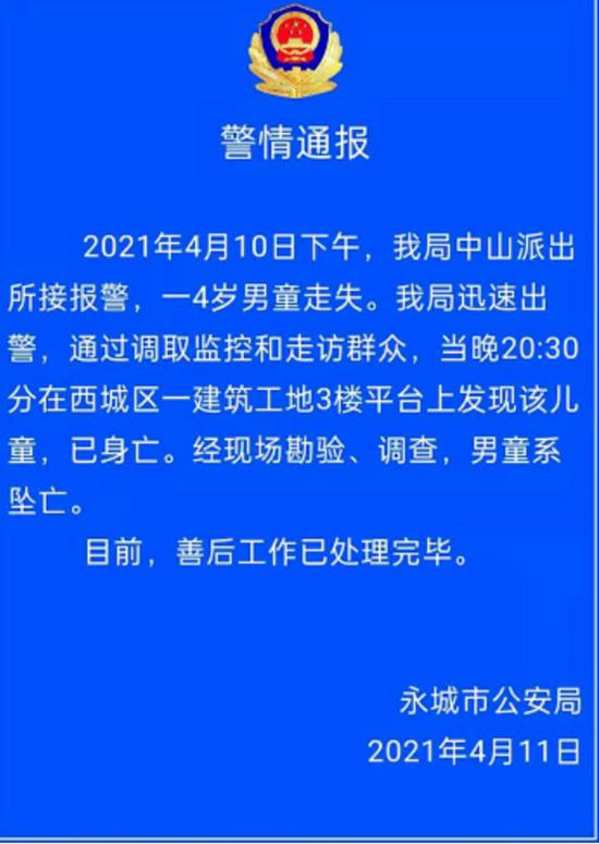 孩子是當天晚上20點30分發現墜亡的
