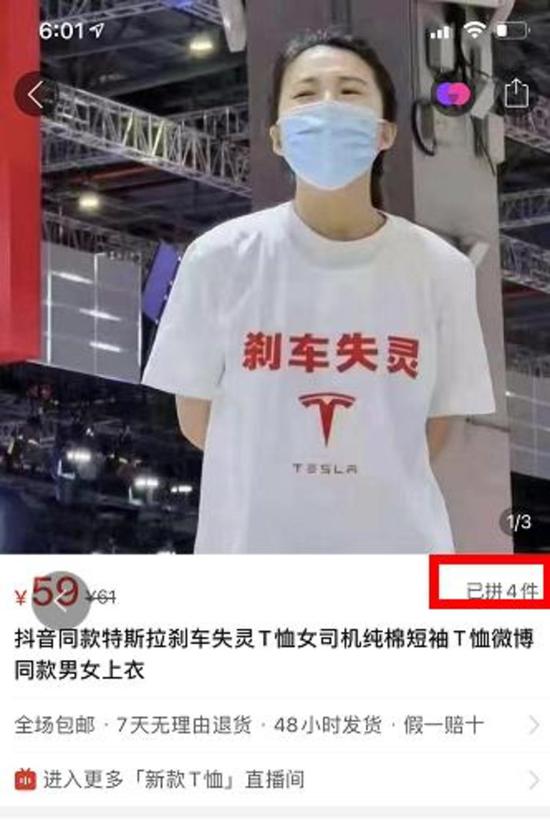 原標(biāo)題:《“特斯拉剎車失靈”同款白T恤已上架電商平臺(tái) 已售出13件》