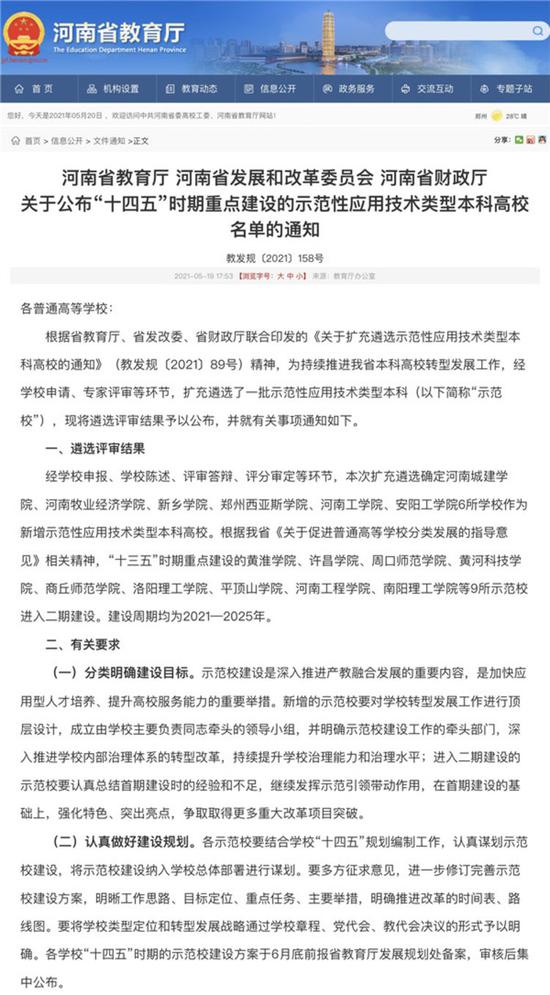 5月20日,記者從河南省教育廳獲悉,河南新增河南城建學院、河南牧業經濟學院、新鄉學院、鄭州西亞斯學院、河南工學院、安陽工學院6所高校為示范性應用技術類型本科高校。