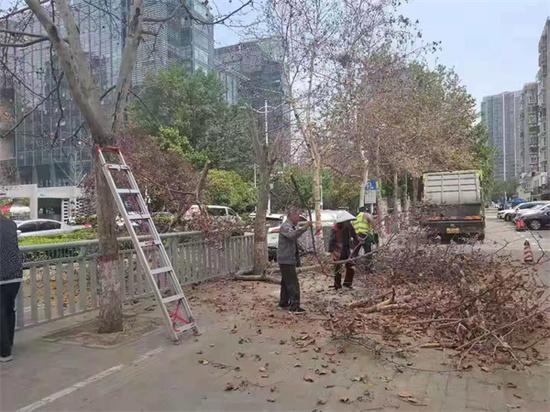 “這十多棵樹是我們修剪的,原由是樹木枯萎,怕砸傷行人,同時也是進行救治需要。”金水區城管局綠化辦公室工作人員表示。