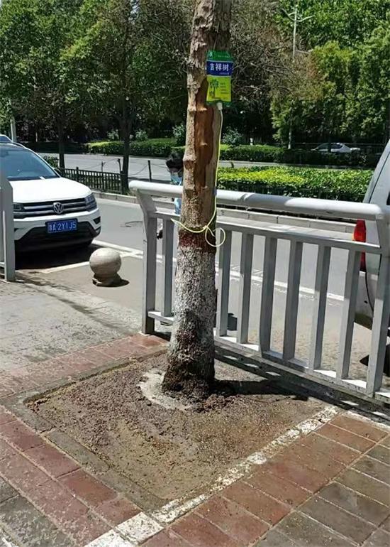 “我從事綠化多年來從沒有見過這種情況,后來我們就針對這些樹木進行勘察,發現有人把樹根邊緣膠連的石子撬開了一部分,然后灌注了毒藥,并用新砂土進行掩埋,因為在我們探查時,有濃烈的毒藥味,同時發現土壤發黑,有黏液狀不明物。這明顯是人為的,我們已經報案,現正在調查。”鄭州金水區城管局綠化科工作人員告訴記者。