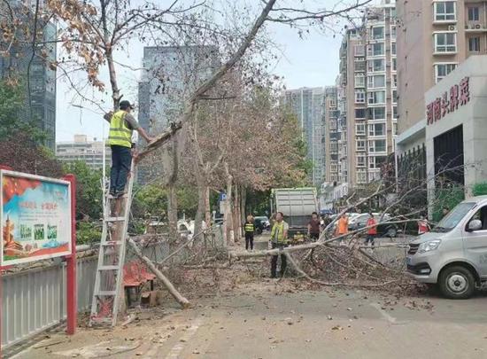 工作人員在調查后發現,這些瀕臨死亡的梧桐被人在根部灌了農藥,綠化采取了大量澆水稀釋根部土壤農藥濃度,截斷部分樹干減少水分養分蒸騰流失,再輸入營養液加以搶救。
