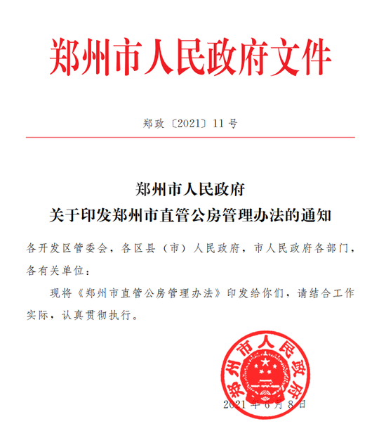 [大河財立方消息]6月22日,鄭州市人民政府發布《鄭州市直管公房管理辦法》。該辦法自2021年7月1日起實施。