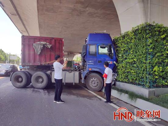 映象網訊(記者 邱延波 通訊員 岳永溆 文/圖)6月22日中午12時許,一輛沿鄭州市西三環由北向南行駛的大貨車正常行駛過程中,突遇前方變道車輛,為躲避險情,一頭撞向西三環立交橋下的橋墩。貨車車輛受損,所幸沒有造成人員傷亡。