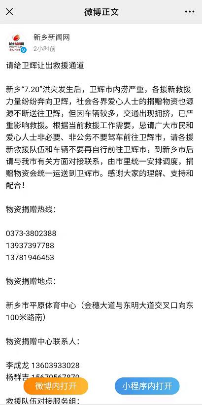 根據當前救援工作需要,懇請廣大市民和愛心人士非必要、非公務不要駕車前往衛輝市,請各援新救援隊伍和車輛不要再自行前往衛輝市,到新鄉市后請與該市有關方面對接聯系,由市里統一安排調度,捐贈物資會統一運送到衛輝市。感謝大家的理解、支持和配合!