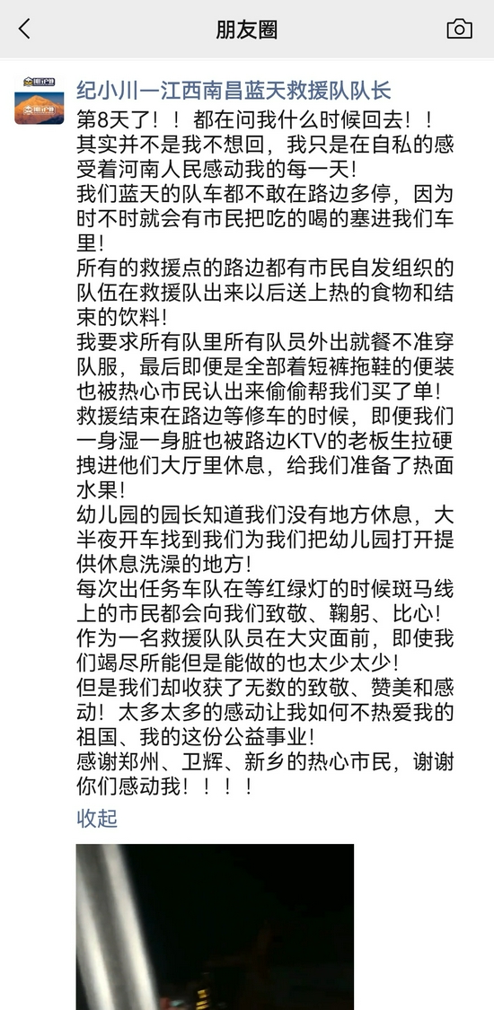 [大河報·大河財立方](記者 裴熔熔 文圖)7月28日中午,江西南昌藍天救援隊隊長紀小川更新了一條朋友圈,短短400余字間,細數了此次在河南救援期間收獲的感動。