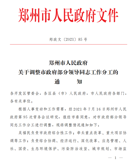 根據(jù)人事變動和工作需要,經(jīng)2021年7月16日鄭州市人民政府第95次常務會議研究,報經(jīng)市委同意,對市政府部分領導同志工作分工進行調(diào)整,現(xiàn)將調(diào)整情況通知如下: