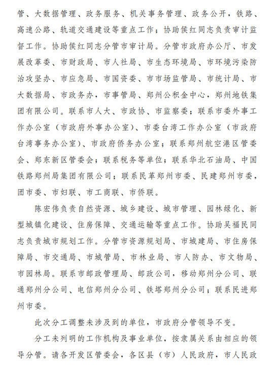 [大河財立方消息]7月30日,鄭州市人民政府發(fā)布關于調(diào)整市政府部分領導同志工作分工的通知。