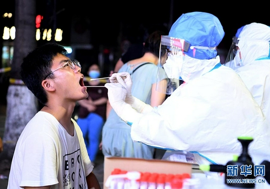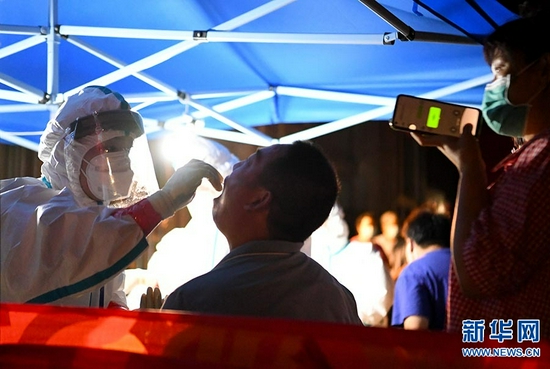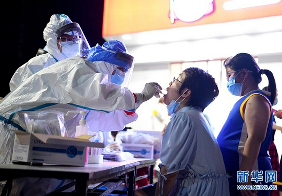 7月31日,在鄭州市二七區淮河路街道興華社區核酸檢測點,工作人員對市民進行核酸檢測取樣。