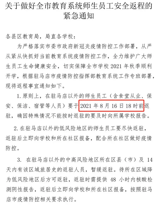 8月14日,平頂山市新冠肺炎疫情防控教育體育系統(tǒng)工作專班辦公室發(fā)布通知,建議暑期離平師生8月15日之前返平。