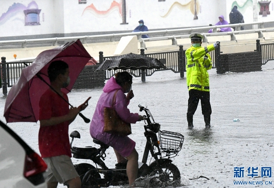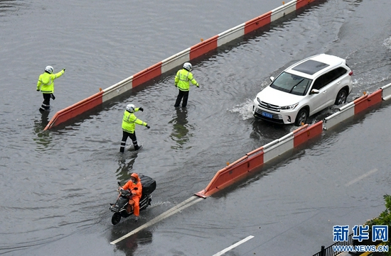 8月22日,交警在鄭州市金水路下穿京廣鐵路隧道附近冒雨執(zhí)勤。新華社記者 李嘉南 攝
