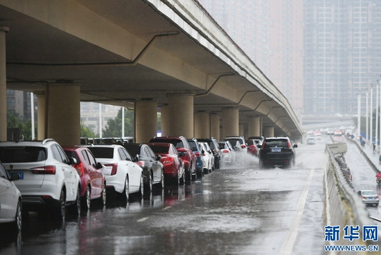 8月22日,一輛汽車從臨時停在鄭州市河醫(yī)立交橋上避險的汽車旁駛過。新華社記者 張浩然 攝