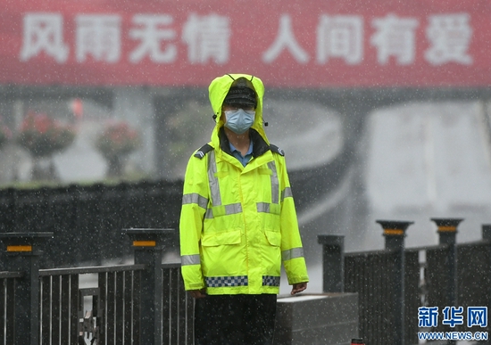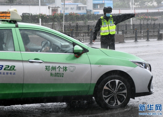 8月22日,交警在鄭州市花園路冒雨指揮交通。新華社記者 朱祥 攝
