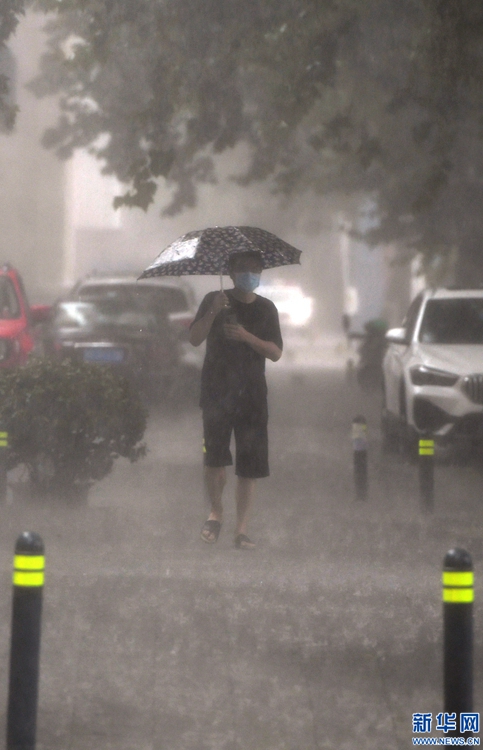 8月22日,市民在鄭州市花園路上冒雨前行。新華社記者 李嘉南 攝