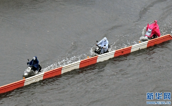 8月22日,市民在鄭州市花園路涉水騎行。新華社記者 朱祥 攝