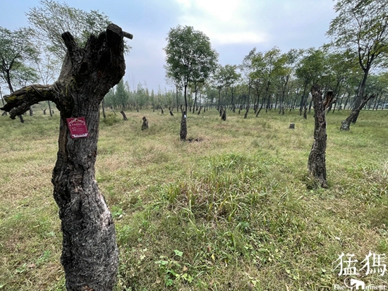 而在距離新移植古棗樹林不遠(yuǎn)的地方,還有一處豎有“新鄭市薛店鎮(zhèn)古棗樹警示教育基地”牌子的古棗樹林,這里樹齡數(shù)百年不等的百十棵古棗樹絕大多數(shù)已經(jīng)枯死。據(jù)附近村民介紹,這是2014年前后移栽過來的古棗樹,移栽過來后無人管理早就枯死了。