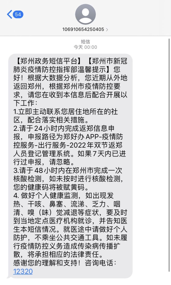 除了上述問題,今天還有不少省內低風險區域返鄭人員收到了鄭州政務短信平臺的短信通知,要求“需于48小時內在鄭州市完成一次核酸檢測,如未按時進行核酸檢測,健康碼將被賦黃碼?!?/p>