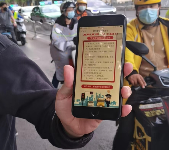 鄭州交警在查處非機動車、電動車等交通違法時,通過依法依規處罰、現場學習交通法規,掃碼下載朗讀并保證遵守“安全文明出行承諾”等三位一體的形式,提高交通參與者的安全守法意識。