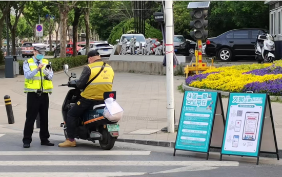 這幾日,不少電動車駕駛者因沒有佩戴頭盔、走機動車道、逆行等,被交警攔下后嘗試了“新辦法”。記者在現場看到,交警攔下這些違法的電動車駕駛員后,先是批評教育,然后,讓違法者下載“安全文明出行承諾書”并現場朗讀。