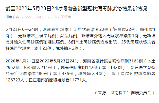 2020年1月21日至2022年5月23日24時,河南省累計報告確診病例3163例(本土2952例、境外輸入211例),現(xiàn)有住院病例142例(本土142例),尚在醫(yī)學(xué)觀察的無癥狀感染者480例(本土476例,境外輸入4例)。累計追蹤到密切接觸者126723人,正在觀察的密切接觸者11771人。