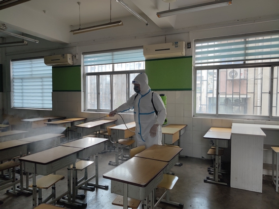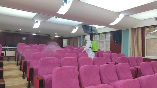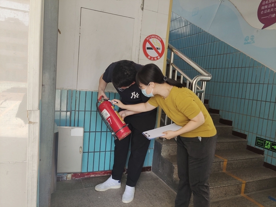 “我們深入到各個教學樓、功能室、樓頂、廁所等重點區域,檢查安全隱患。然后還重點檢查了像衛生站、隔離室、物資儲備室這些重要場所防疫的工作開展情況。另外,我們還聯合鄭州中原區戎客應急救援隊開展了校園清潔消毒活動,對整個校園進行了全面消殺。”程江燕說。