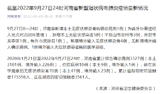 原標題:《截至2022年9月27日24時河南省新型冠狀病毒肺炎疫情最新情況》