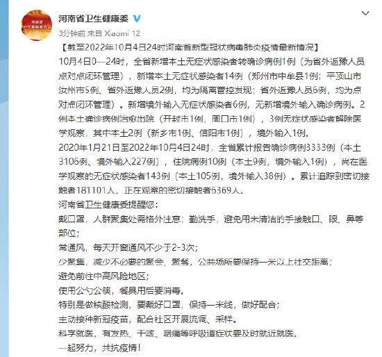 原標題:《截至2022年10月4日24時河南省新型冠狀病毒肺炎疫情最新情況》