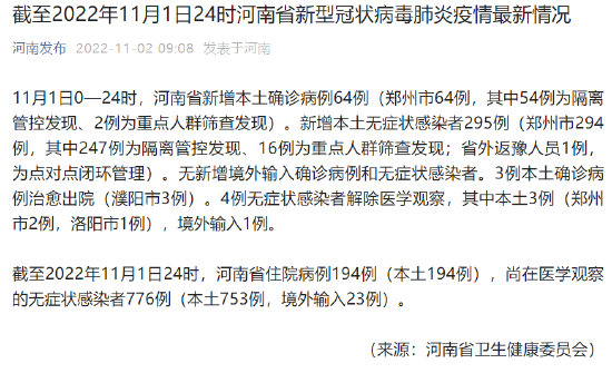 截至2022年11月1日24時,河南省住院病例194例(本土194例),尚在醫學觀察的無癥狀感染者776例(本土753例,境外輸入23例)。