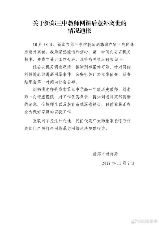 原標(biāo)題:《官方通報教師網(wǎng)課后離世:針對網(wǎng)傳遭網(wǎng)暴事件,公安已立案偵查》