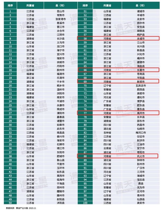 榜單顯示,河南省共有5地進入百強,分別為永城市、長葛市、新鄭市、禹州市、鞏義市。