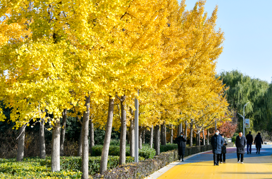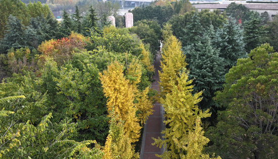 湖西游路及林蔭廣場上,種植有300余株樹齡30年左右的銀杏樹,目前也已是金黃一片。