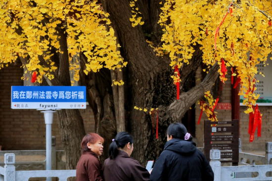 經開區蝶湖西北側的法云寺內,樹齡1200多年的古銀杏樹的樹葉已經全部變為金黃,微風吹過,片片銀杏葉飄落,吸引了眾多市民前來拍照,觀賞。這棵銀杏樹為鄭州市主城區內最古老的一棵銀杏樹。