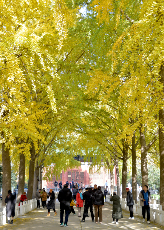 鄭州城隍廟里金黃的銀杏,已成了一道靚麗的風景線,此時,滿樹銀杏葉變得金黃璀璨,片片銀杏葉一半沐浴陽光,一半在風里飛揚,增添了些許浪漫。