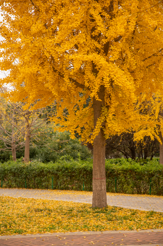 鄭州市人民公園南門,是鄭州市區內最高大的成片銀杏林觀賞處,胡公祠前,整齊排列,葉落之時公園一般會專門不清掃,漫步在一片暖意的檸檬黃色中,令人沉醉不已。