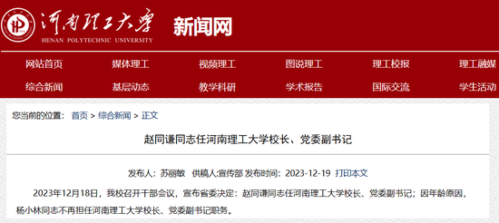 [大河財立方消息]12月19日消息,據河南理工大學網站,日前河南理工大學召開干部會議,宣布省委決定:趙同謙同志任河南理工大學校長、黨委副書記;因年齡原因,楊小林同志不再擔任河南理工大學校長、黨委副書記職務。