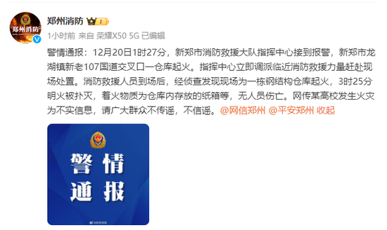 警情通報:12月20日1時27分,新鄭市消防救援大隊指揮中心接到報警,新鄭市龍湖鎮新老107國道交叉口一倉庫起火。指揮中心立即調派臨近消防救援力量趕赴現場處置。消防救援人員到場后,經偵查發現現場為一棟鋼結構倉庫起火,3時25分明火被撲滅,著火物質為倉庫內存放的紙箱等,無人員傷亡。網傳某高校發生火災為不實信息,請廣大群眾不傳謠,不信謠。