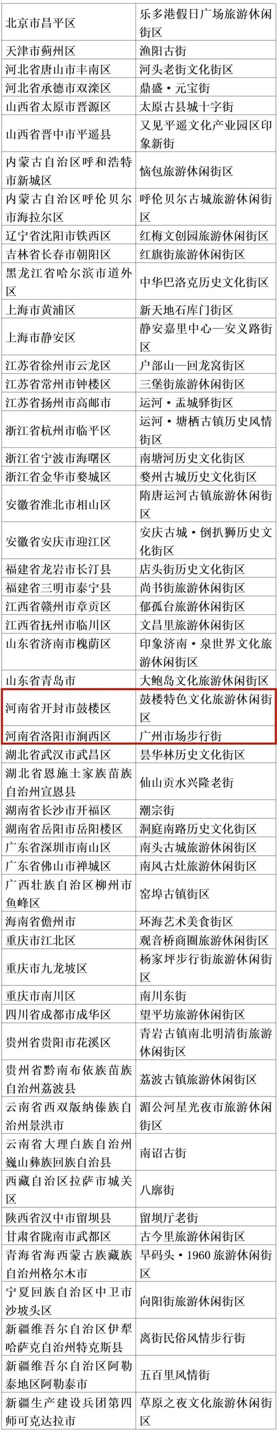 根據中華人民共和國旅游行業標準《旅游休閑街區等級劃分》(LB/T 082-2021),經省級文化和旅游行政部門推薦,文化和旅游部按程序組織認定并完成公示,確定以下53家單位為第三批國家級旅游休閑街區,其中,河南兩單位入選,分別是:河南省開封市鼓樓區鼓樓特色文化旅游休閑街區、河南省洛陽市澗西區廣州市場步行街。