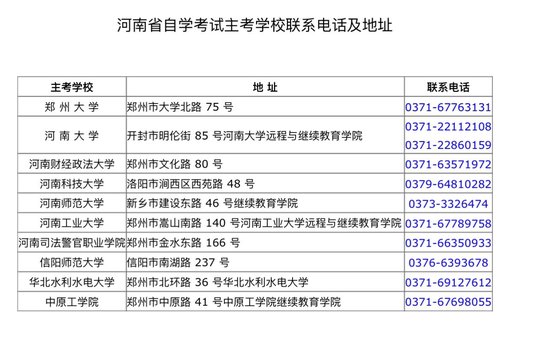 河南省自學考試主考學校聯系電話及地址