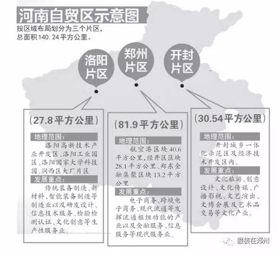 根據規劃,河南自貿區以鄭州為主,包括鄭州、洛陽、開封三個片區,網內網外相結合,一區多片分層推進,總面積140.24平方公里,其中鄭州片區81.9平方公里,洛陽片區27.8平方公里,開封片區30.54平方公里。