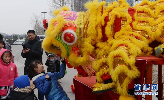 2月18日,鄭州市鄭東新區如意湖文化廣場,小朋友在和“獅子”互動。新華網發(張濤 攝)