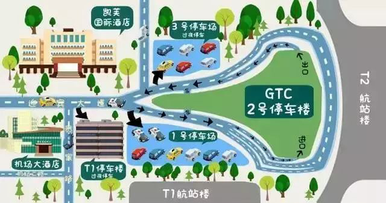 2。自駕抵達機場的旅客,如需長時間停放車輛,可以依照下圖箭頭指示,按照道路交通指示標志沿迎賓大道行駛至相應停車場。