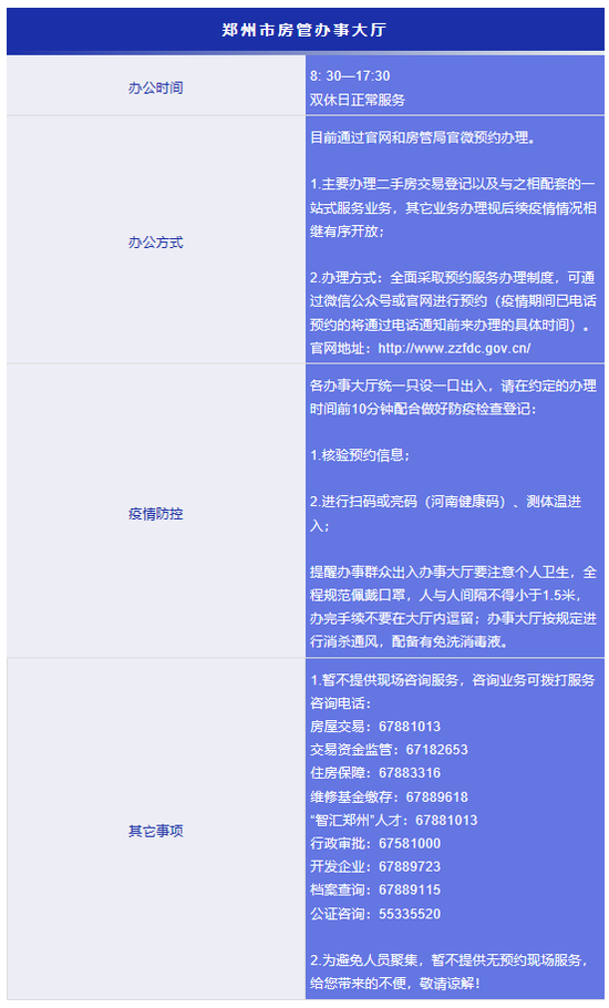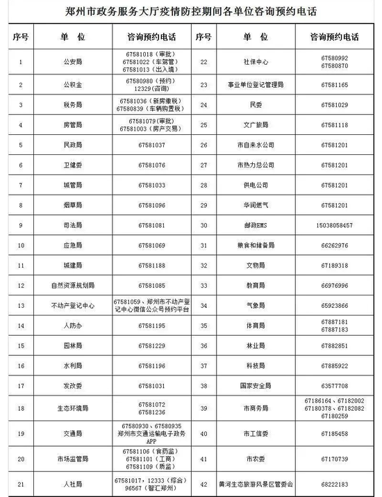 附:防控期間鄭州市政務服務大廳各單位咨詢預約電話
