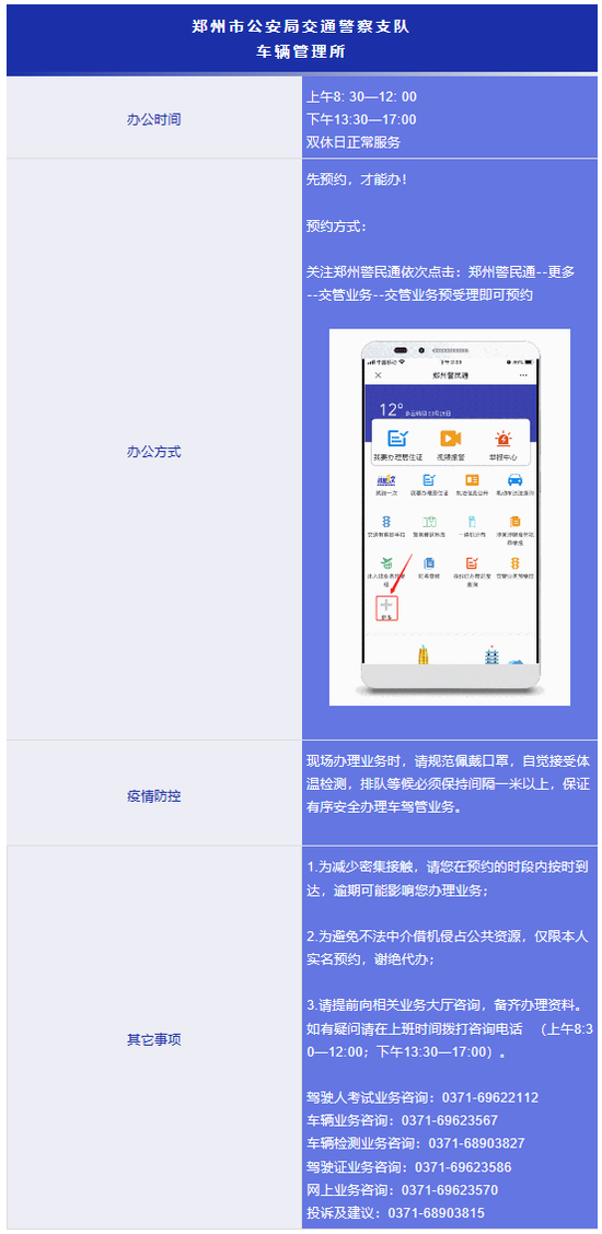另:鄭州各交警大隊車駕管業務也已全面復工,請依據個人業務需求進行預約辦理;鄭州市各機動車檢測站也已陸續恢復審車辦理,可在“鄭州警民通”進行車檢點預約,錯峰審車。