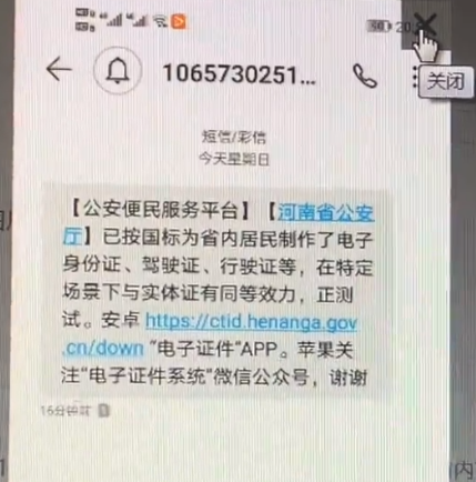 車友反映,在手機上收到一條短信,內容是:“公安便民服務平臺提醒您:河南省公安廳已按國標為省內居民制作了電子身份證、駕駛證、行駛證等。在特定場景下與實體證有同等效力,正測試。”后面還配上了安卓下載APP的鏈接 和蘋果系統關注微信公眾號的名稱。這是真的嗎?