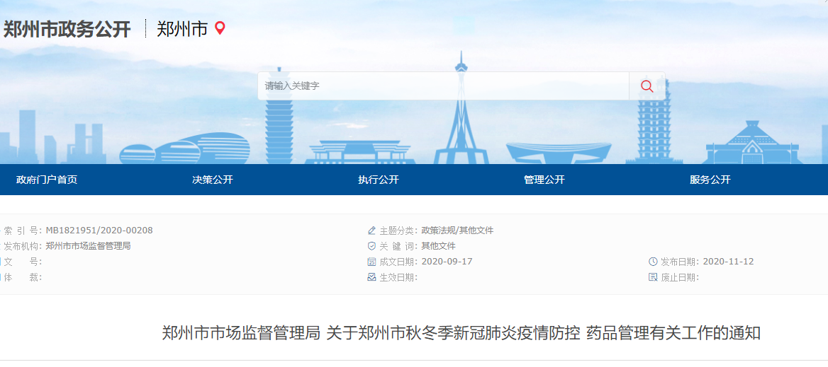 附:鄭州市市場監督管理局關于鄭州市秋冬季新冠肺炎疫情防控藥品管理有關工作的通知