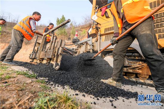 3月15日,河南省盧氏縣文峪鄉望家山,工人正在鋪設路面。