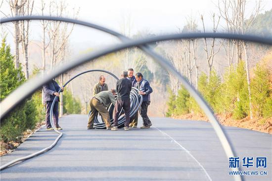 3月15日,河南省盧氏縣文峪鄉望家山,村民沿路布放生活和生產用水管道。