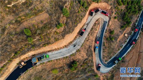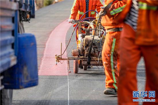 3月15日,河南省盧氏縣文峪鄉望家山,筑路工人正在描畫“彩虹”路。