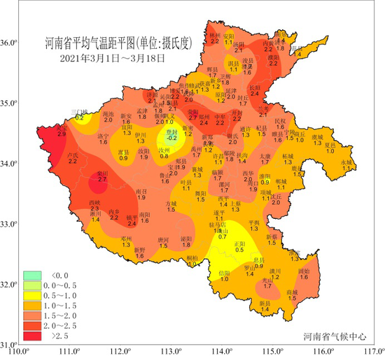 氣象監(jiān)測顯示,3月以來,全省平均氣溫為9.2℃,較常年同期偏高1.6℃。全省除登封接近常年略偏低外;其余地區(qū)平均氣溫較常年同期偏高0.2~2.9℃,其中豫西西部和豫西南、豫中、豫北、豫東的局部偏高2.0~2.9℃。