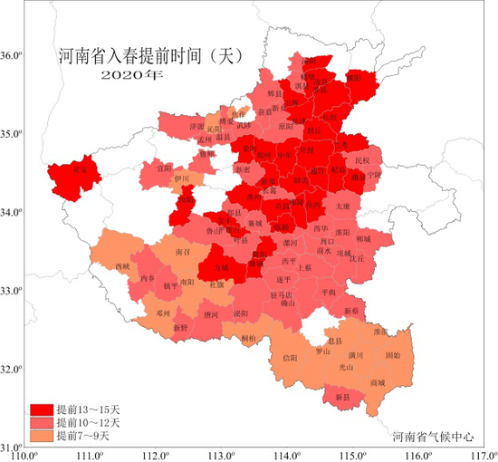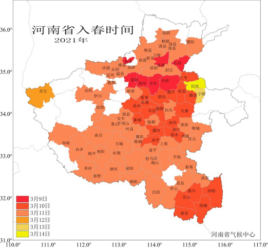 由于氣溫偏高,截至3月18日,全省有90站在9-14日先后達到入春標準(氣候季節(jié)劃分QX/T 152—2012),其中9-11日依次有7站、22站和58站,12-13日各1站;與常年相比,以上站點入春偏早7天以上, 其中豫中大部以及豫北、豫東、豫西、豫西南的局部入春提前13~15天入春。